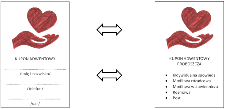 1. Pobieramy KUPON ADWENTOWY od Ks. Proboszcza 2. Wypełniamy 3. Wymieniamy „nasz” KUPON ADWENTOWY na KUPON ADWENTOWY PROBOSZCZA 4. Z KUPONU ADWENTOWEGO PROBOSZCZA możemy zrealizować jedną z propozycji w dowolnym terminie 5. Podobnie Ks. Proboszcz ...
